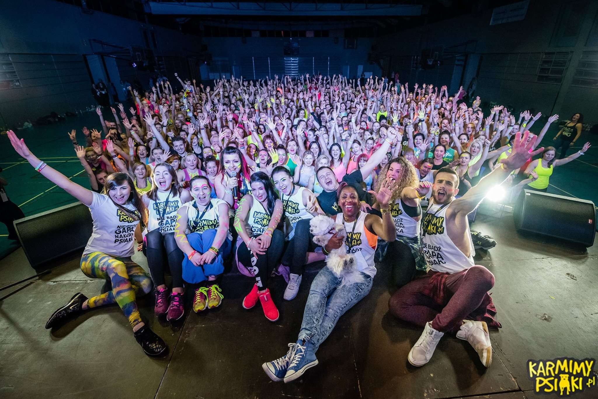 Kiedy wszyscy już się pomalowali nastał czas oczekiwania na start. To było coś wspaniałego! Każdy czuł w powietrzu energię, która już za chwilę miała eksplodować! I wiecie co? Tak się właśnie stało! Wystarczyło tylko, aby instruktorzy weszli na scenę i już w pierwszej sekundzie nastąpił prawdziwy wybuch! Wprost magiczne przeżycie! Wspominając ten wieczór od razu zaczynamy mieć gęsią skórkę! Każdy z Zumbowiczów zachwycał nas na nowo ogromem radości i ciepła. Było wspaniale i naprawdę lepiej nie mogliśmy sobie tego wymarzyć! Tak właśnie zaczęło się 3-godzinne zumbowe szaleństwo! Wszyscy tańczyli przez cały ten czas z szerokimi uśmiechami na twarzach dając z siebie wszystko dla czworonogów.