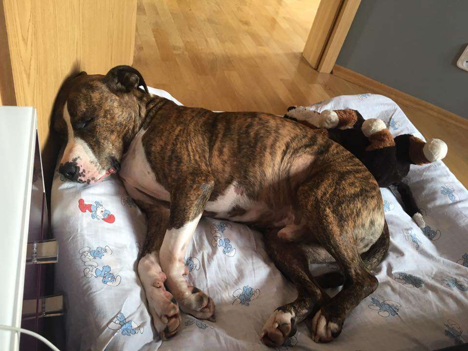 Pierwszy tydzień Cyrek odsypiał, a gdy gdziekolwiek się ruszyłam to chodził za mną krok w krok. Początkowo obiecałam mężowi, że nie będę psa wpuszczać do łóżka, ale zaczęłam później mu tłumaczyć, że bidulka tyle lat spała na słomie bądź betonie, że zasługuje teraz na odrobinę miłości i wygody. Od tej pory między godziną 6 a 7 rano Cyrusek kładzie się między nas i tak jeszcze przytuleni do siebie, przesypiamy godzinkę.