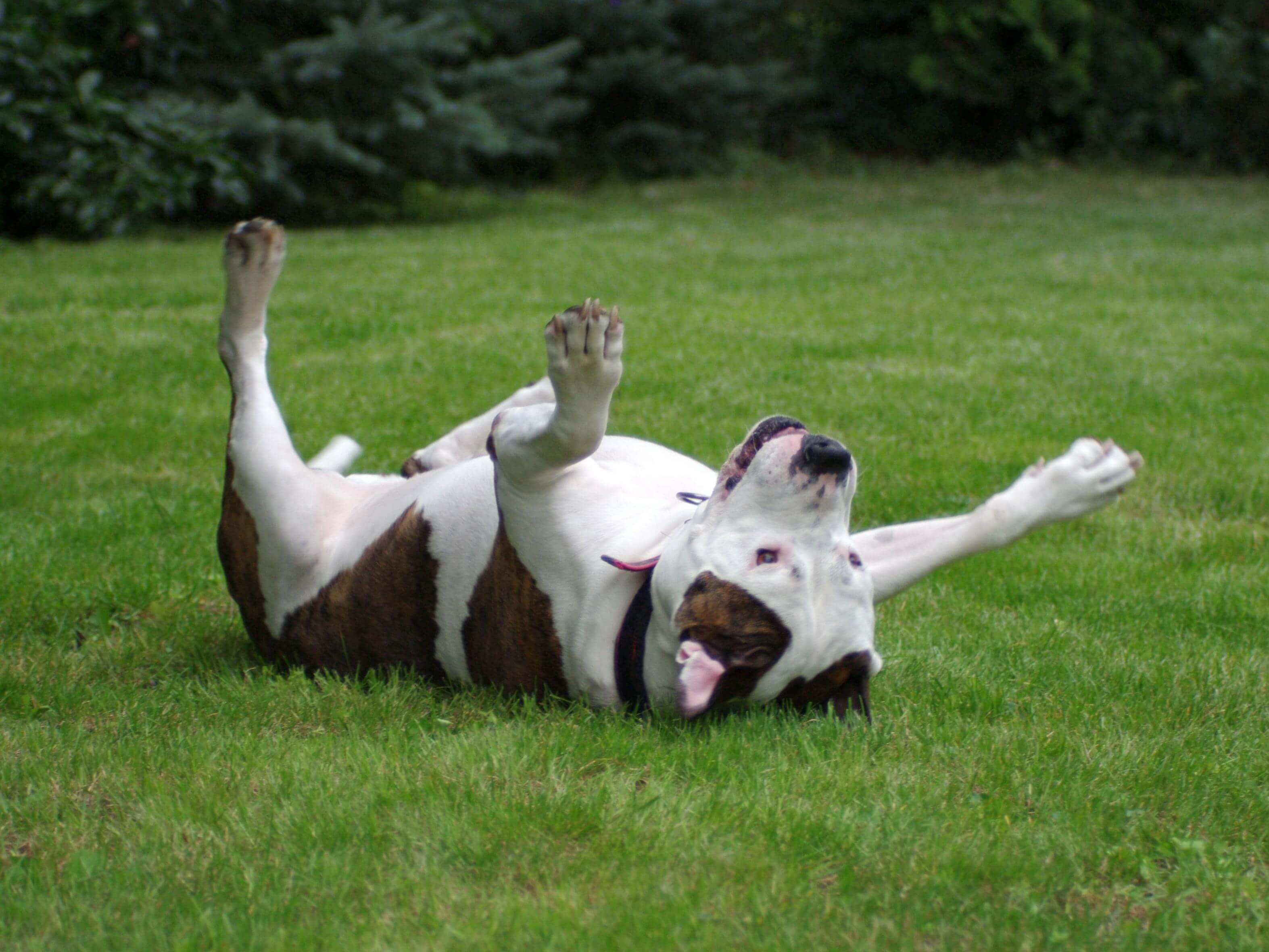 Na drugi dzień On był już z nami. Jakież było moje i dzieci zdziwienie, gdy w drzwiach pojawił się nie tyle amstaff, ile z półtora amstaffa. Wielkie bydle z szerokim uśmiechem i wielkimi gałami, patrzącymi z lekkim niepokojem i ogromną ciekawością na to, co się dzieje. Najpierw urządził sobie małą wycieczkę zapoznawczą po naszym domu. Wszedł do pokoju dzieci, wytarzał się w ich dywanie i chyba stwierdził: „ok, tu jest fajnie, chyba trochę tu zostanę”.