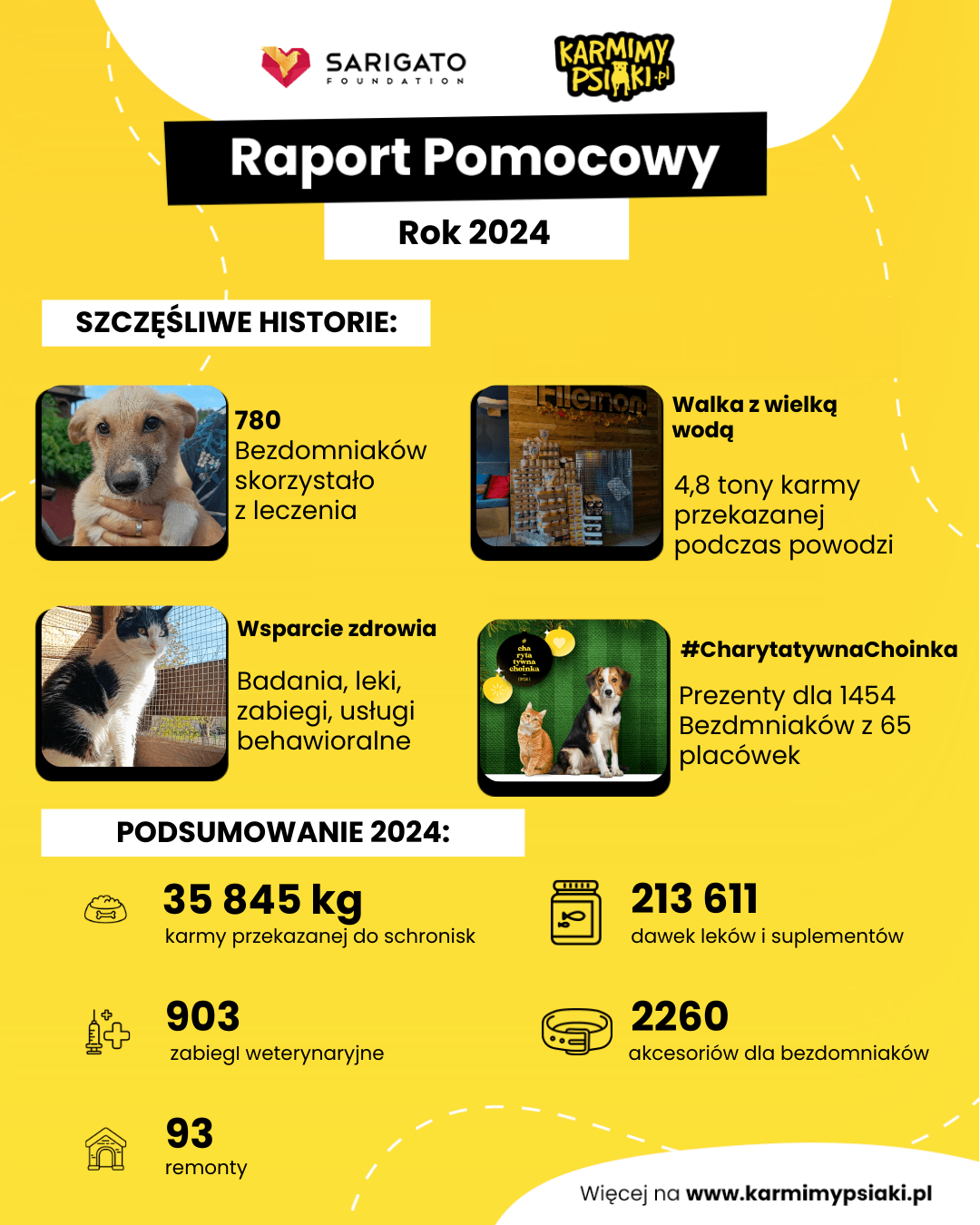 Blisko 36 ton karmy, ok. 212 tysięcy sztuk leków i suplementów, 903 zabiegi weterynaryjne – to tylko niektóre z efektów działań Karmimy Psiaki w 2024 roku. Dzięki wsparciu wspaniałych darczyńców docieramy z pomocą tam, gdzie jest ona najbardziej potrzebna.
