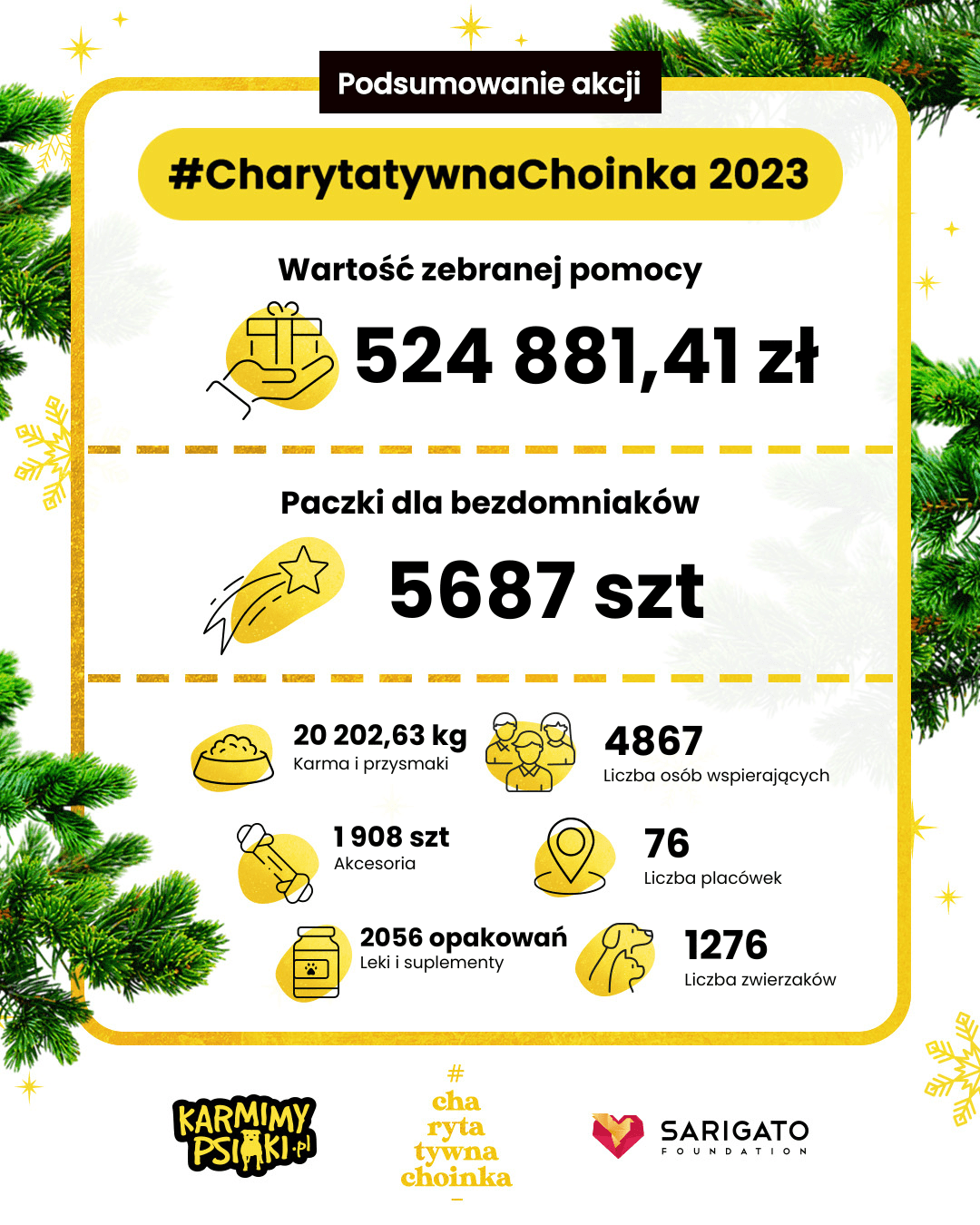 Aż 524 888,41 zł zebrano w postaci darowizny finansowej i rzeczowej w ubiegłorocznej już akcji #CharytatywnaChoinka organizowanej przez Karmimy Psiaki (Fundacji Sarigato). Ta wyjątkowa inicjatywa objęła swoim zasięgiem pomocy 1276 bezdomnych zwierząt z 76 sprawdzonych przytulisk z całej Polski. Psiaki i kociaki otrzymały 56187 paczek z konkretnym zapotrzebowaniem dla danego czworonoga, w tym 20 202,63 kg karmy i przysmaków, 2 056 opakowań leków i specjalistycznych suplementów, 1 908 sztuk akcesoriów.