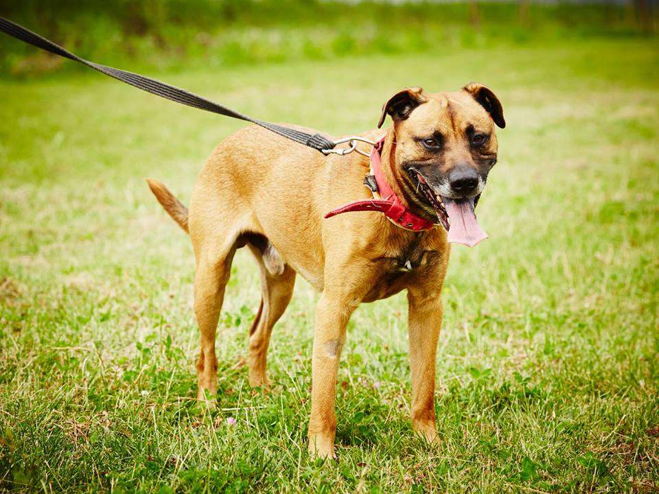 Piesek jest w typie rasy amstaff: wyróżnia go piękna smukła sylwetka oraz ciemny pysk przypominający maskę.