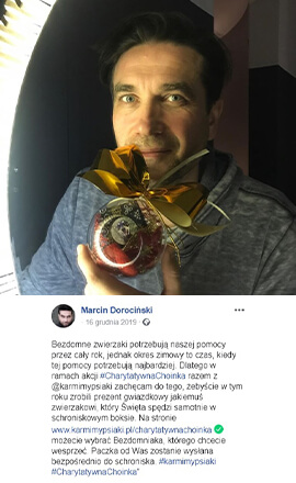 Święta to czas, kiedy obdarowujemy prezentami najbliższych. Pod opieką Karmimy Psiaki przebywa niemal 2000 Psiaków i Kociaków. One nie mają nikogo bliskiego, a te Święta spędzą w schroniskowym boksie. Chcemy przynajmniej trochę umilić im ten czas i wysyłać jak najwięcej prezentów pod choinkę.