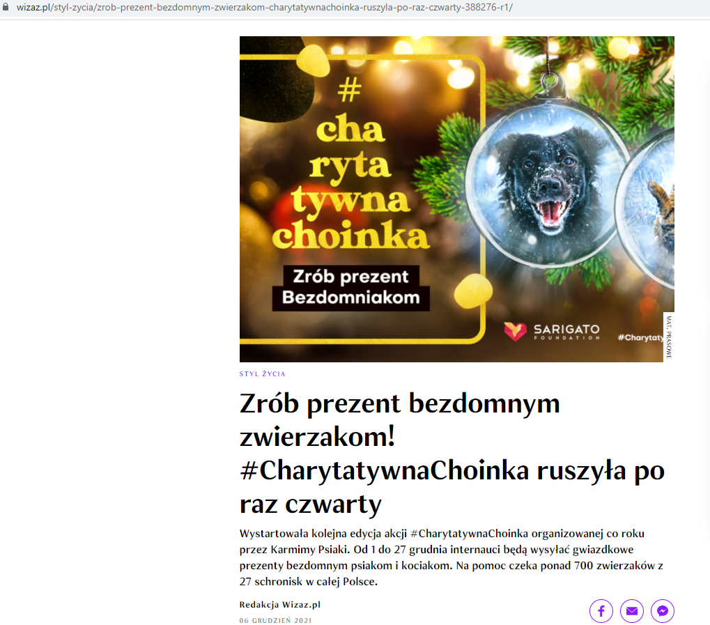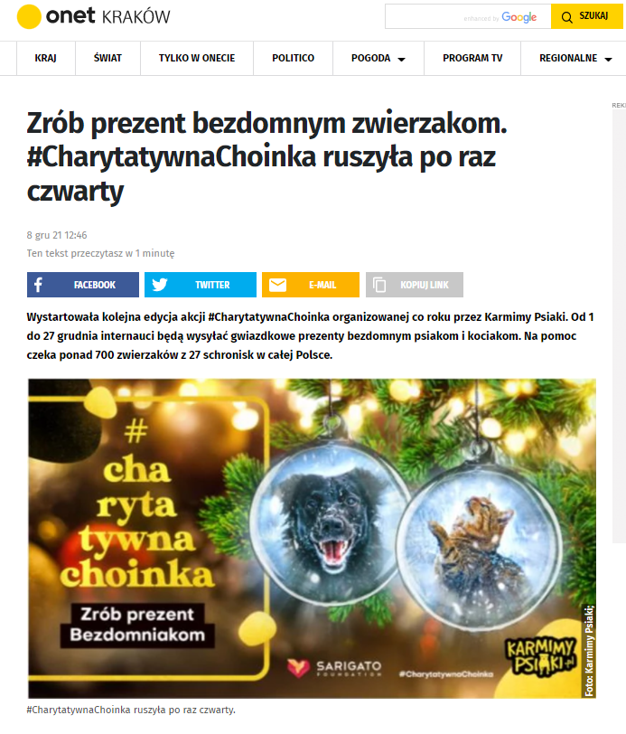 Święta to czas, kiedy obdarowujemy prezentami najbliższych. Pod opieką Karmimy Psiaki przebywa niemal 2000 Psiaków i Kociaków. One nie mają nikogo bliskiego, a te Święta spędzą w schroniskowym boksie. Chcemy przynajmniej trochę umilić im ten czas i wysyłać jak najwięcej prezentów pod choinkę.