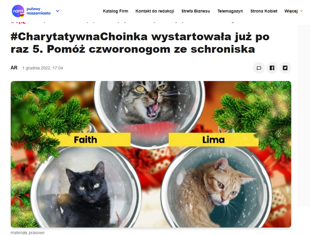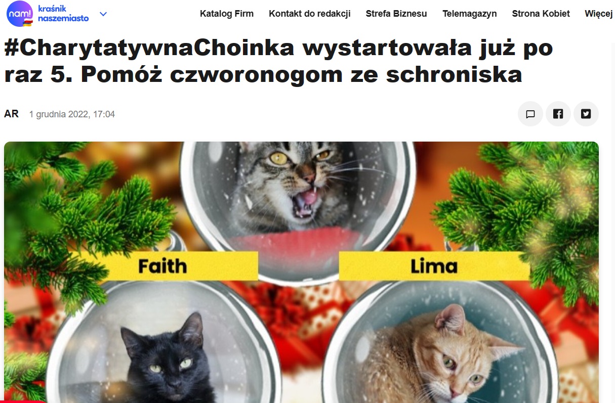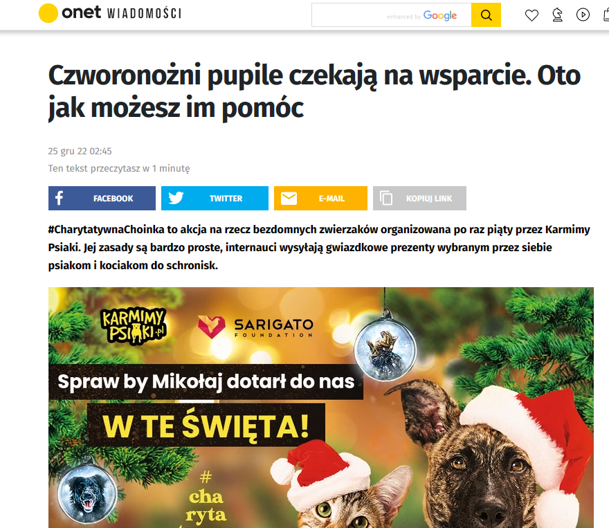 Święta to czas, kiedy obdarowujemy prezentami najbliższych. Pod opieką Karmimy Psiaki przebywa niemal 2000 Psiaków i Kociaków. One nie mają nikogo bliskiego, a te Święta spędzą w schroniskowym boksie. Chcemy przynajmniej trochę umilić im ten czas i wysyłać jak najwięcej prezentów pod choinkę.